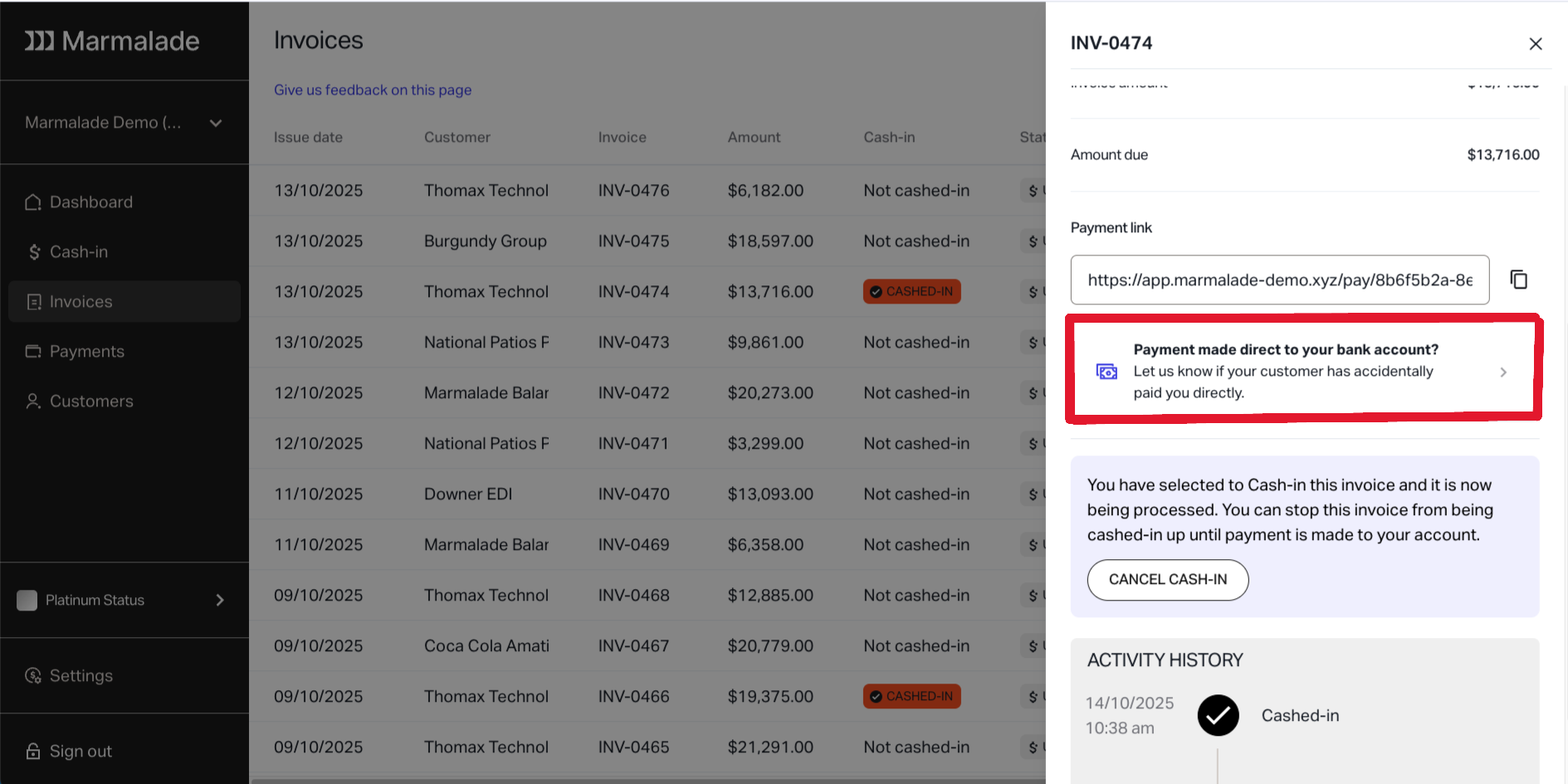 It's important to follow up with these customers and request that they update payment details for future invoices. Payment into the Marmalde account will also ensure their invoices in the future are assessed for cash-in.