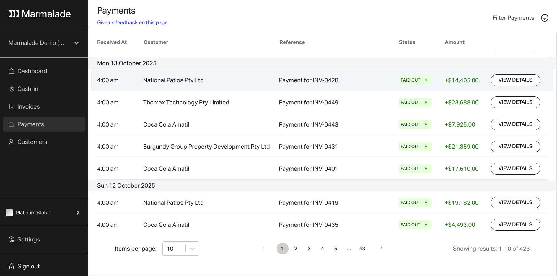 .The Payments tab on your Marmalade Dashboard shows all payments that have been received into your Marmalade account. Click on 'View Details' to see which invoice(s) the payment was allocated to.