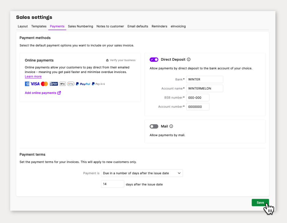 To make your invoices eligible for cash-in, you need to add your Marmalade payment details to your MYOB invoice payment settings.