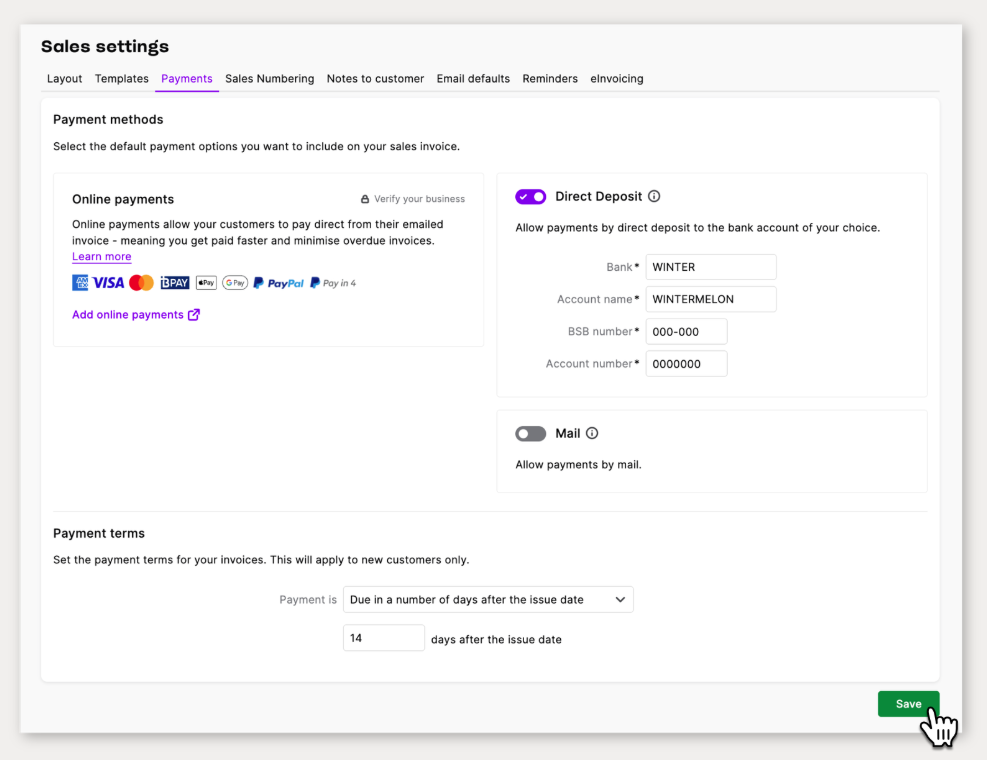 Before an invoice can be systematically assessed for cash-in, please add your Marmalade banking details to your MYOB invoice payment settings.