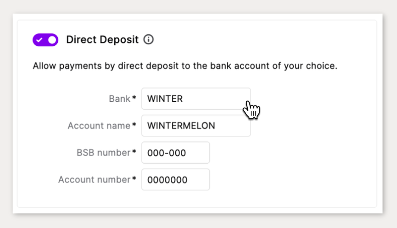 Paste the provided details from the email into the corresponding fields for Bank, Account Name, BSB Number and Account Number.