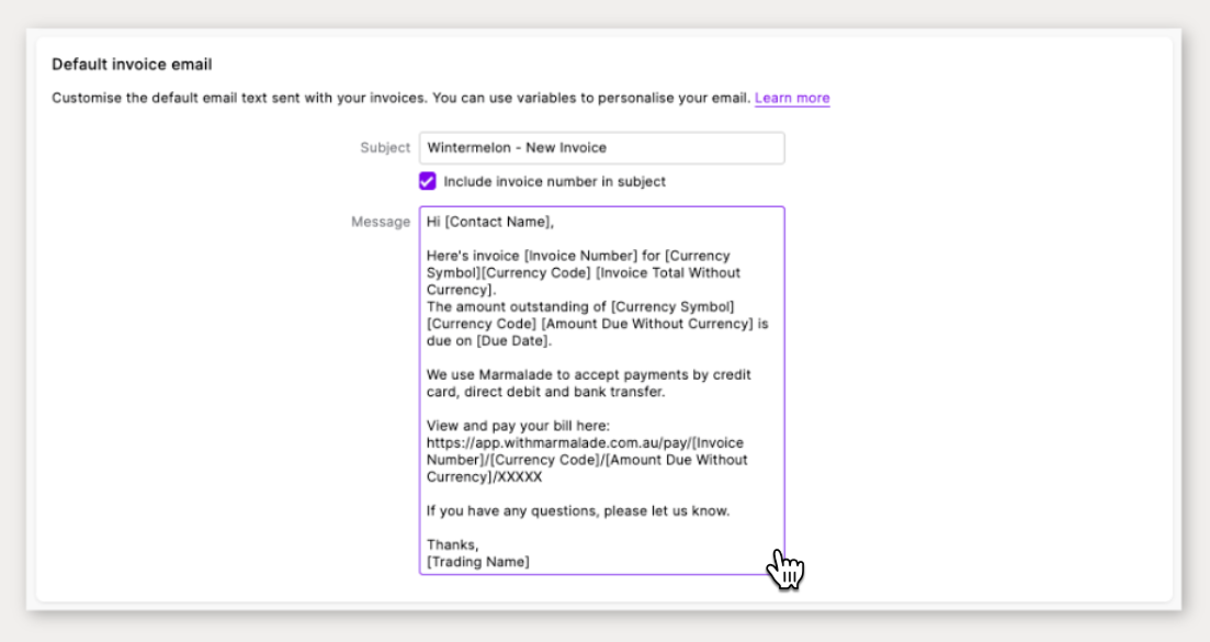 Your email template is now updated with your unique Marmalade payment link in MYOB.
