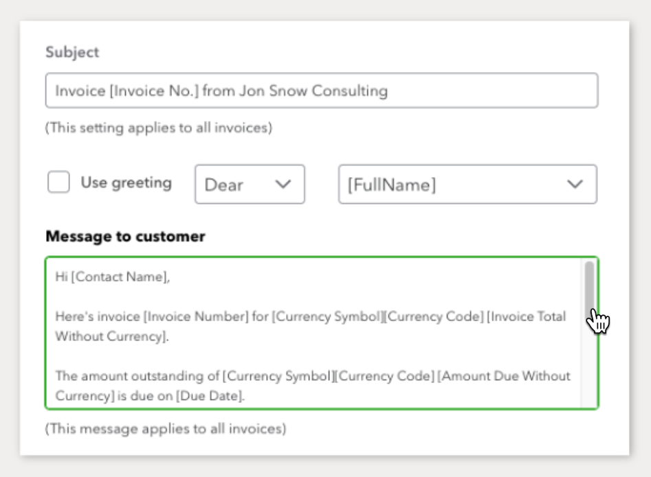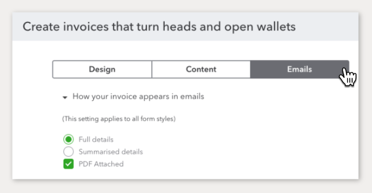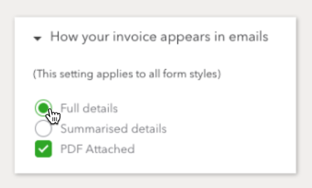 Under the How your invoice appears in emails drop-down, select Full Details and PDF Attached.