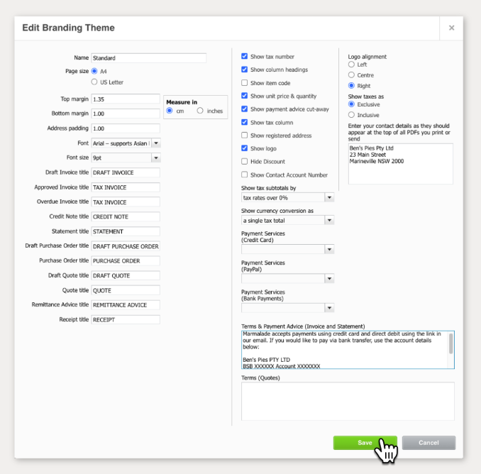 To make your invoices available for cash-in, you need to add your Marmalade payment details to your standard Branding Theme in Xero.