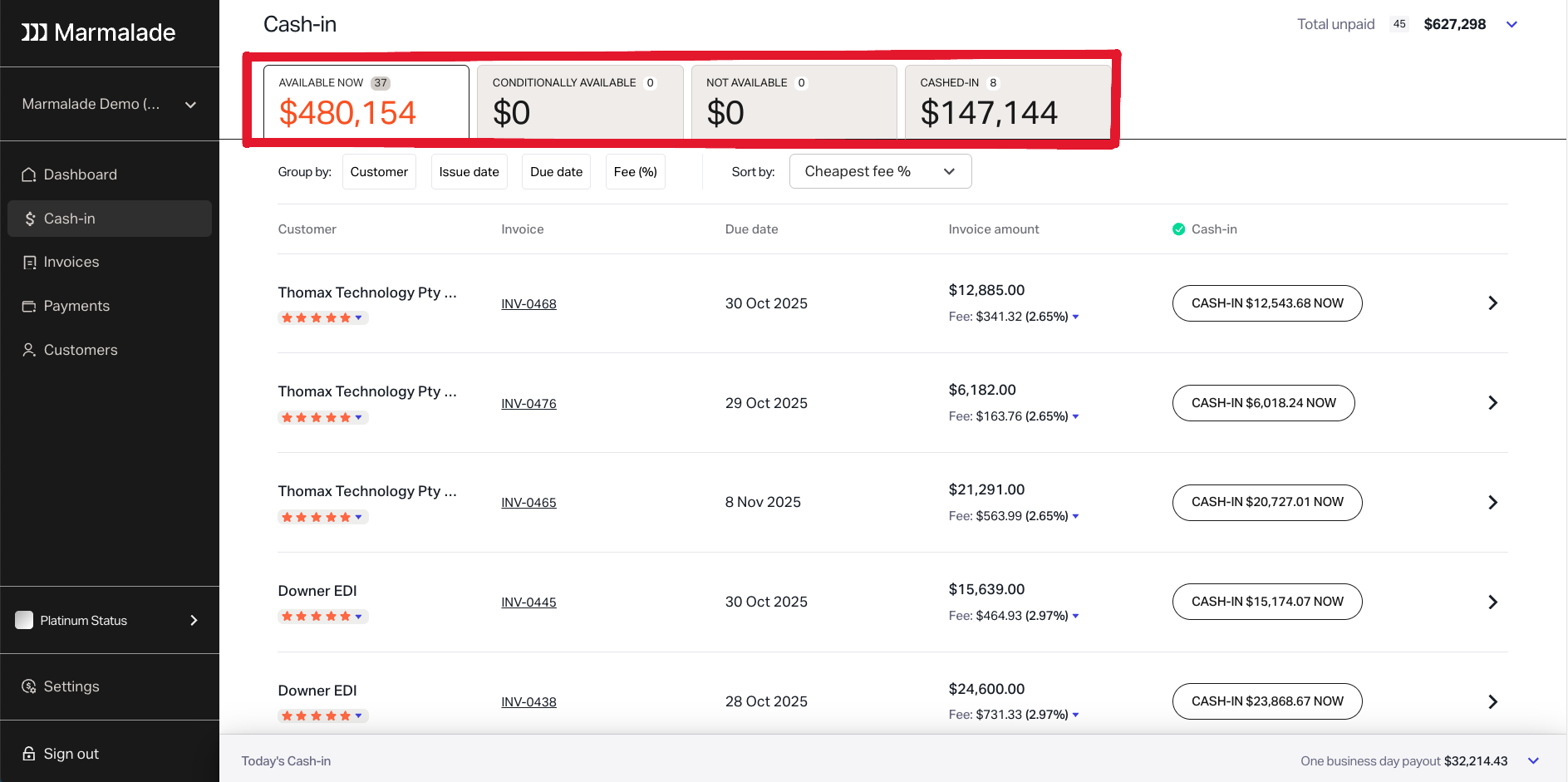 - Not Available: These invoices are not available for cash-in due to the total fee exceeding Marmalade’s threshold of 5%